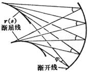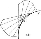 The limit position of the intersection of two adjacent planes in the ridge plane family is called the feature line of the family, and the envelope of the feature line (if it exists) is called the ridge line of the family, which divides the envelope surface into two leaves, with the ridge Lines as "sharp bobbins" of surfaces (figure ( d ) ) |
