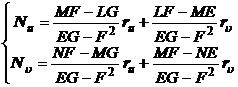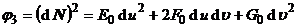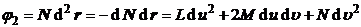 In the formula, the partial derivative takes values at the point , E , F , and G are the first basic quantities, and N is the normal unit vector of the surface at the point M.