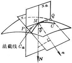 [ Radius of curvature of an arbitrary truncated line ] Using an arbitrary plane truncated surface passing through the point M , a sectional line C (figure ) is obtained, its tangent at the point M is PQ , and the normal unit vector of the curve C is n , through the straight line PQ and the curved surface The normal unit vector N of N is the plane , and the normal section is obtained by cutting the surface . If the angle between the vector N and n is , and the radius of curvature is , then the radius of curvature of the section C is![]()