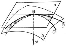 [ Geodesic curvature and Beltrami formula ] Let M be a point on the surface S , C be a curve passing through the point M on S , be the tangent of S on M , and be the orthoprojection of C on , then the curvature of M Called the geodesic curvature of C at M , denoted as .![]()