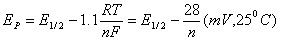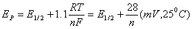 v1/2C 式中k'和k''是比例常数,在25℃时, k' = 2.69×105 , k'' = 2.56×105 n=dV/dt是施加极化电压的速度,单位为V/s。a是转换系数,a<1。na是电极反应中决定速度步骤的电子转移数。C是被测物质浓度,单位为mol/ml。ip是电流,单位为A。其它参数的意义同尤考维奇方程。