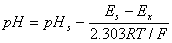 溶液PH测量 PH玻璃电极是测量氢离子活度最重要的指示电极,它和甘汞电极组成的体系是最常用的体系。溶液PH值的测量通常采用与已知PH值的标准缓冲溶液相比较的方法进行。对于缓冲溶液和未知溶液,测得的电动势分别为: (1.16) (1.17) 式中EAgCl,Ag是玻璃膜电极内参比电极银一氯化银电极的电位,ESCE是外参比电极饱和甘汞电极的电位,Ea是不对称电位,Ej是液体接界电位,ar是内参比溶液氢离子活度,as为缓冲溶液氢离子活度,ax为未知溶液的氢离子活度。若在测量过程中,Ea与Ej保持不变,结合(1.16)式与(1.17)式,得到未知溶液的pH值为  该式称为PH的操作定义或实用定义,由此可以看出,未知溶液的PH值与未知溶液的电位值成线性关系。这种测定方法实际上是一种标准曲线法,标定仪器的过程实际上就是用标准缓冲溶液校准标准曲线的截距,温度校准则是调整曲线的斜率。经过校准操作后,PH的刻度就符合标准曲线的要求了,可以对未知溶液进行测定,未知溶液的PH值可以由PH计直接读出。实验中用作标准的缓冲溶液的PH值见表1.5。