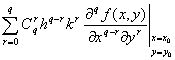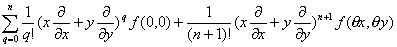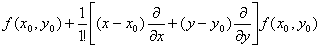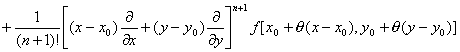 [泰勒公式] 假定在某一点(x0,y0)的邻域D内二元函数f(x,y)有直到n+1阶为止的一切连续偏导数.分别给x及y以改变量h及k,使连结点(x0,y0)及(x0+h,y0+k)的直线段不越出D外,那末f (x,y)在D内可表成形式: