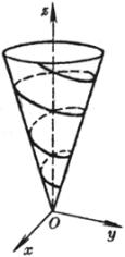 [圆锥螺旋线] 与一圆锥面母线的交角为定角的曲线称为圆锥螺旋线(图7.20),其方程为