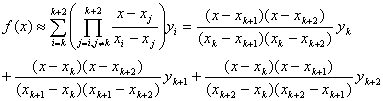 [一元三点插值公式]  已知单变量函数y=f(x)n个节点上的值,对于插值区间内任一点x,可按下面公式近似计算函数值