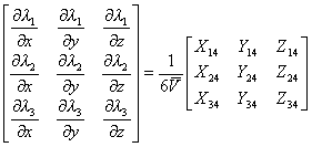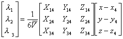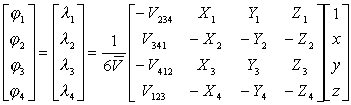 [型函数]    就是体积坐标(i=1,2,3,4),它们与直角坐标之间的线性关系式为