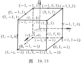 [二十节点六面体] 二十节点包括六面体的八个顶点和十二个棱边的中点(图19.13)。其型函数为