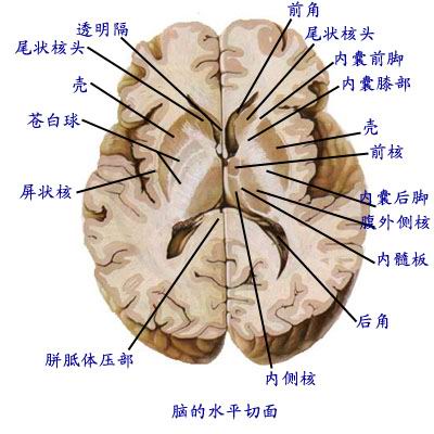 内囊:位于背侧丘脑、尾状核、豆状核之间,由上行的感觉纤维和下行的运动纤维构成。在脑的水平切面上呈“><”状,分为内囊前肢、内囊膝、内囊后肢三部。