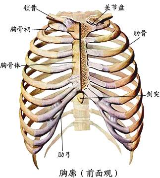 2)肋的前端连结:肋的前端连结不尽相同。①第一肋借肋软骨连于胸骨柄。②第二肋借肋软骨连于胸骨角。③第3~7肋借肋软骨与胸骨体相连。④第8~10肋借肋软骨依次连于上位肋软骨,形成肋弓。⑤第11、12肋前端游离于腹肌之中,称浮肋。