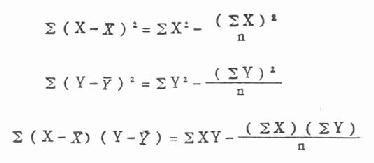 式(9.1)中r为相关系数,∑(X-X)2为X的离均差平方和,∑(Y-Y)2为Y的离均差平方和,∑(X-X)(Y-Y)为X与Y的离均差乘积之和,简称离均差积之和,此值可正可负。以此式为基础计算相关系数的方法称积差法,在实际应用时式(9.1)中各离均差平方和(简称差方和)与积之和可化为