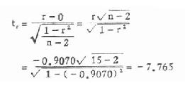 由于来自ρ-0的总体的所有样本相关系数呈对称分布,故r的显著性可用t检验来进行。本例r=-0.9070,进行t检验的步骤为: