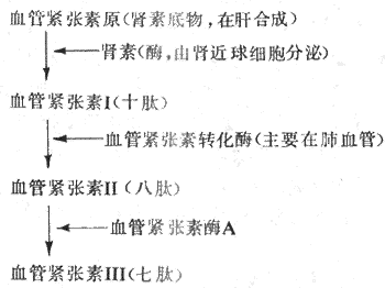 当各种原因引起肾血流灌注减少时,肾素分泌就会增多。血浆中Na+浓度降低时,肾素分泌也增加。肾素分泌受神经和体液机制的调节,详见第八章。 对体内多数组织、细胞来说,血管紧张素I不具有活性。血管紧张素中最重要的是血管紧张素Ⅱ。血管紧张素Ⅱ可直接使全身微动脉收缩,血压升高;也可使静脉收缩,回心血量增多。血管紧张素Ⅱ可作用于交感缩血管纤维末梢上的接头前血管紧张素受体,起接头前调制的作用,使交感神经末梢释放递质增多。血管紧张素Ⅱ还可作用于中枢神经系统内一些神经元的血管紧张素受体,使交感缩血管紧张加强。因此,血管紧张素Ⅱ可以通过中枢和外周机制,使外周血管阻力增大,血压升高。此外,血管紧张素Ⅱ可强烈刺激肾上腺皮质球状带细胞合成和释放醛固酮,后者可促进肾小管对Na+的重吸收,并使细胞外液量增加。血管紧张素Ⅱ还可引起或增强渴觉,并导致饮水行为。血管紧张素Ⅲ的缩血管效应仅为血管紧张素Ⅱ的10%-20%,但刺激肾上腺皮质合成和释放醛固酮的作用较强。 在某些病理情况下,如失血时,肾素-血管紧张素系统的活动加强,并对循环功能的调节起重要作用。