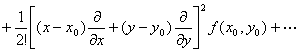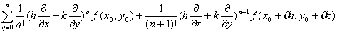 [泰勒公式]  假定在某一点(x0,y0)的邻域D内二元函数f(x,y)有直到n+1阶为止的一切连续偏导数.分别给xy以改变量hk,使连结点(x0,y0)(x0+h,y0+k)的直线段不越出D,那末f (x,y)D内可表成形式: