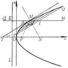 它把M点的焦点半径与直径的夹角(ÐFMG)平分(ÐFMT=ÐTMG),并且一切与切线MT平行的弦被过M点的直径平分(PI=IQ).