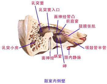 (6)内侧壁:为迷路壁,有前庭窗和蜗窗。 (6) inside wall: for lost walls, windows and vestibular cochlear windows.