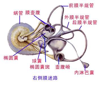 分为膜半规管、椭圆囊和球囊、蜗管。 Into film semicircular canal, utricle and balloon, cochlear duct.