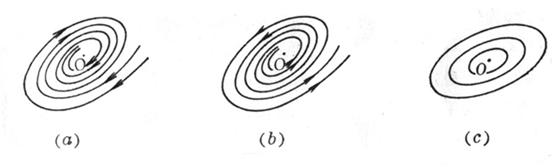 The zero solution is stable . The orbital shape is shown in Figure 13.2( c ). This type of equilibrium point ( 0,0) is called the center, and the center is stable .