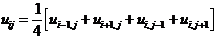 即任一节点(i,j)上uij的值等于周围相邻节点上解的值的算术平均,这种形式的差分方程称为五点格式,在边界节点上取