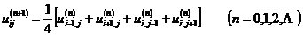 [迭代法解差分方程] 在五点格式的差分方程中,任意取一组初值{uij},只要求它们在边界节点(i,j)上取以已知值(xi*,yj*),然后用逐次逼近法(也称迭代法)解五点格式: