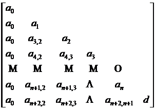 (n+2)方阵的对角线上列出a0,a1,L,an,d(d为符号),在第1列上列出a0(即ai,i=ai-1,i=1,2,L,n+1;an+2,n+2=d;ai,1=a0,i=1,2,L,n+2).