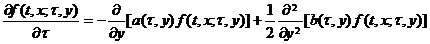 [ Kolmogorov's Second Equation ] If the conditional distribution function   F ( t , x ; τ , y ) of the diffusion process has a distribution density f ( t , x ; τ , y ) , and the following partial derivatives